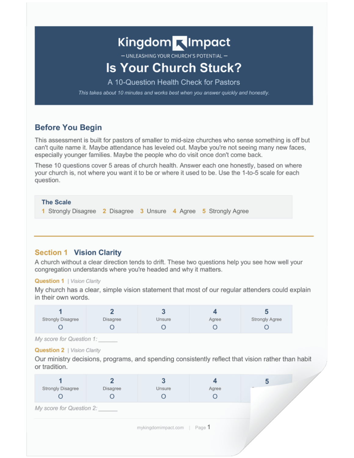 Most pastors in a plateaued church know something is off before they can name it. This free 10-question assessment covers 5 areas of church health and gives you a clear picture of where your church actually stands and where to focus first. It takes about 10 minutes.